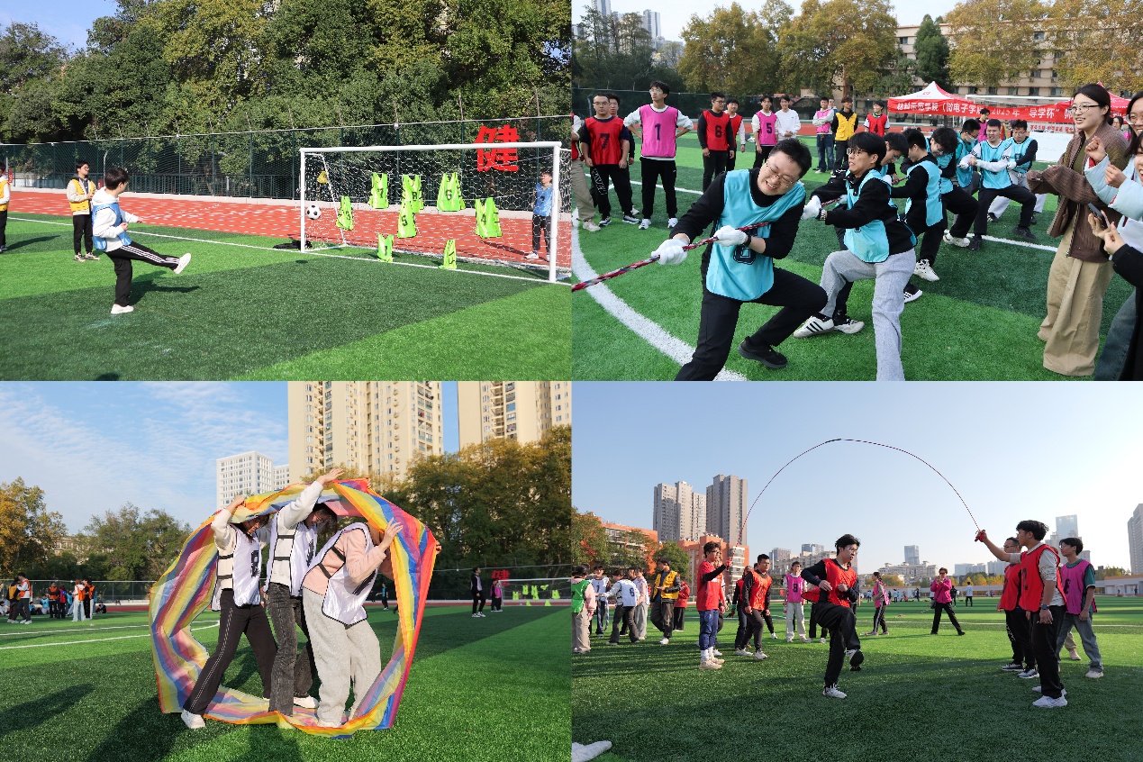 活动伊始,参赛师生在蔡子翾同学的带领下进行了系统性热身,为接下来的比赛做好充分准备。随着裁判一声哨响,各项趣味比赛依次展开。“足球小将”项目中,师生精准射门,赢得阵阵掌声;“一圈到底”环节,队员们手拉手协作,呼啦圈灵活传递;“乒乓球接力”考验配合与专注,师生默契传递,稳步前行;“红尘滚滚”项目中,大家套上布袋,相互扶持,步调一致;“踢毽子”比赛展现技巧与节奏,毽子在空中划出优美弧线;“跳长绳”将现场气氛推向高潮,长绳翻飞中,团队默契不断提升;最后的拔河比赛更是扣人心弦,师生齐心协力,坚持到底,现场加油声、欢呼声此起彼伏,充分展现了团结拼搏的精神风貌。